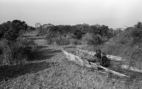 The narrow stern indicated this must have been a sail skiff converted to engine power. It was about 20 feet in length.